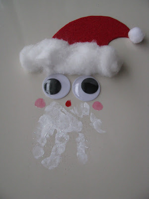primary activity where they were doing these cute cute santa's. So I took home some of the extras and we finally got to them today. They are pretty easy and so darn cute. We used stiffened adhesive backed felt for the hat and put it all on a tile. I love children handprints!